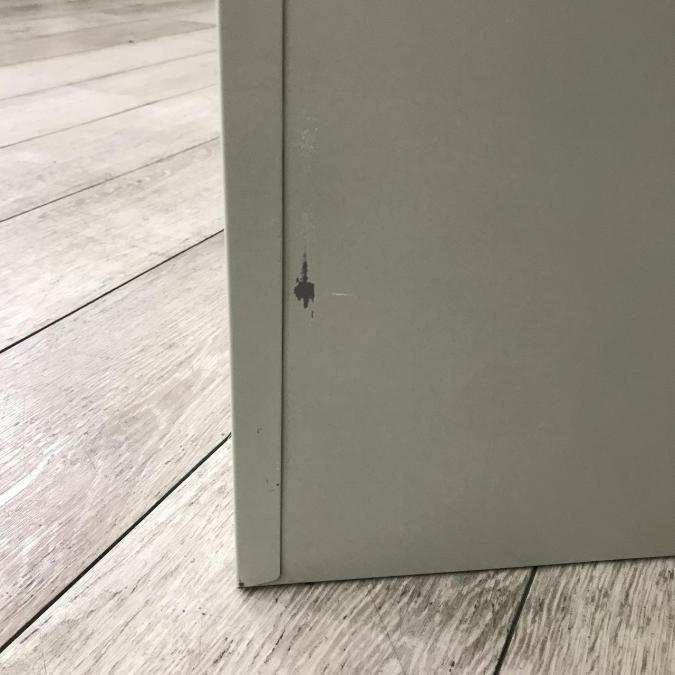 - 目立つ箇所複数あり深い傷・凹みが商品全体にある。(例、天板、正面、背部、サイド部分にある。)