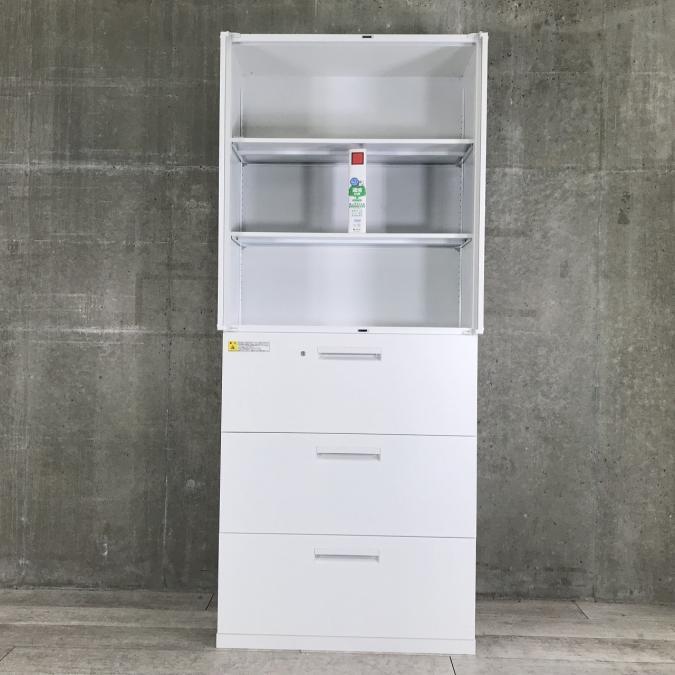 観音開きタイプの書庫と引き出しタイプの書庫を上下に組み合わせた、定番のセットです。