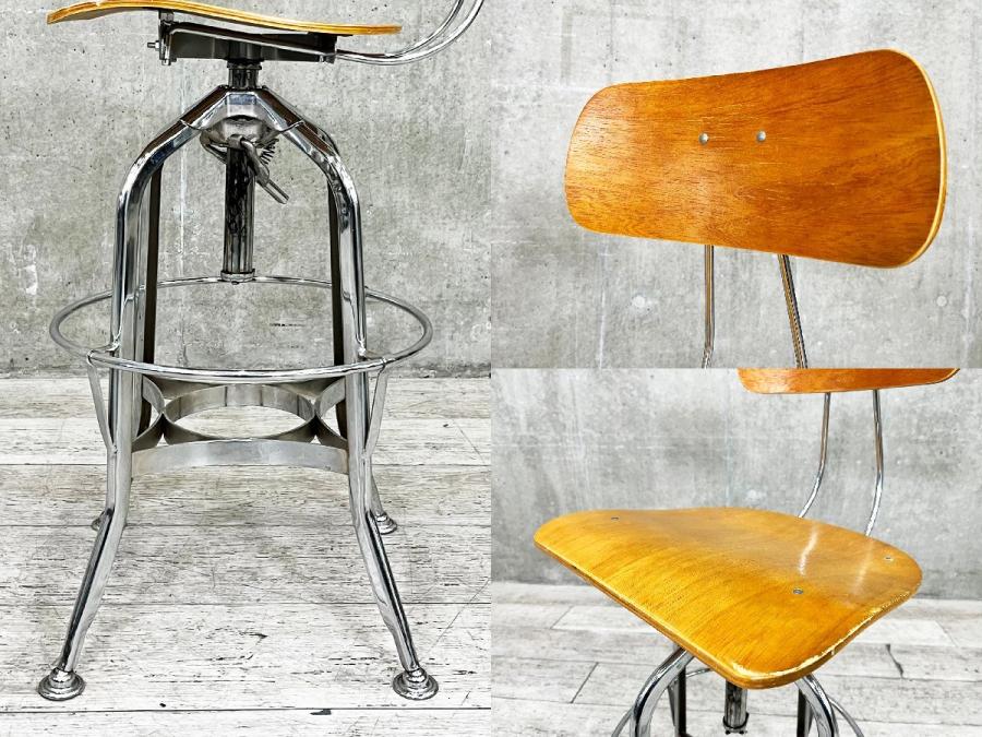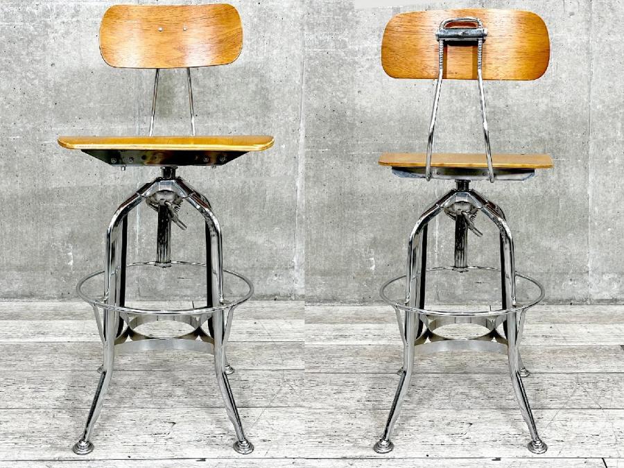 シート下のレバーでシートを昇降させる、アナログな構造がインダストリアルなテイストにピッタリとはまるアイテムです。バックレストも高さが調整できる仕様ですので、身長や用途に合わせて使えます。