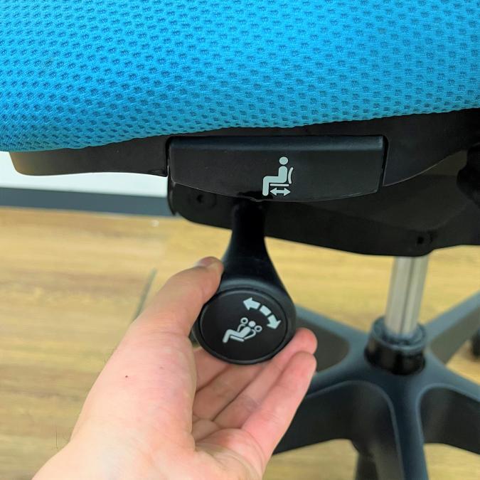 - 座面右下のダイヤル操作で、リクライニングの強弱調整が行えます。これまでのダイヤル式よりも、少ない回転数で、最弱?最強の調整が可能です。