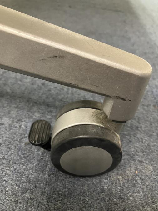 - 一部不具合あり天板歪み、アジャスター無し、キャスター使用不可ようなそのテーブルの本来の効用を果たすための機能以外の一部が使用不可な状態。(例、キャスターロッ ク機能使用不可、棚板無し等がある。)