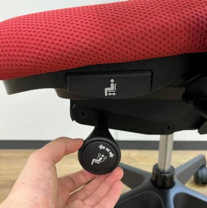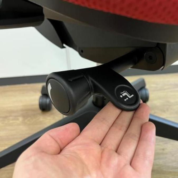 - 座面右下のダイヤル操作で、リクライニングの強弱調整が行えます。これまでのダイヤル式よりも、少ない回転数で、最弱?最強の調整が可能です。