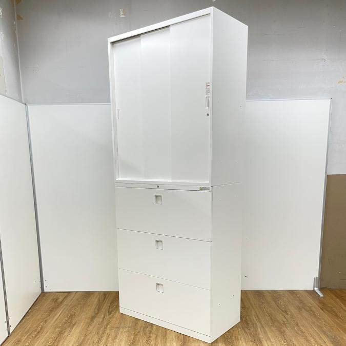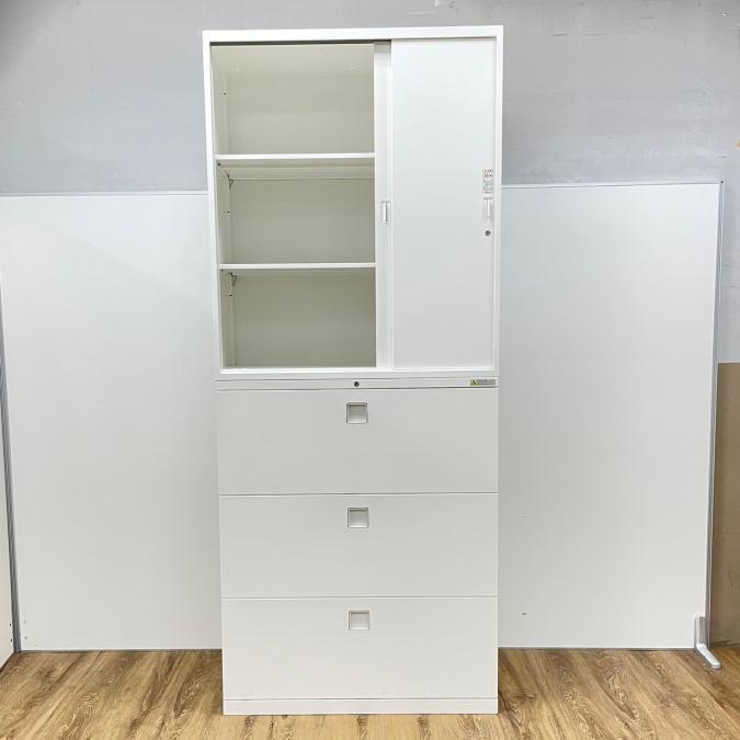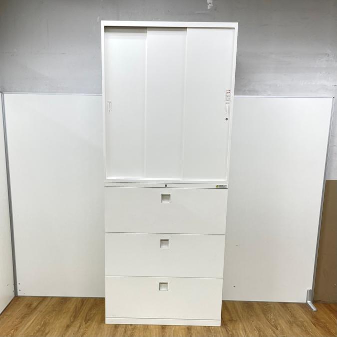 スライド式の扉+引き出しタイプの便利な書庫セットが入荷!使い勝手抜群のハイキャビネットが入荷! ■オカムラ/レクトライン/ホワイト 2枚引き戸+3段ラテラルキャビネット