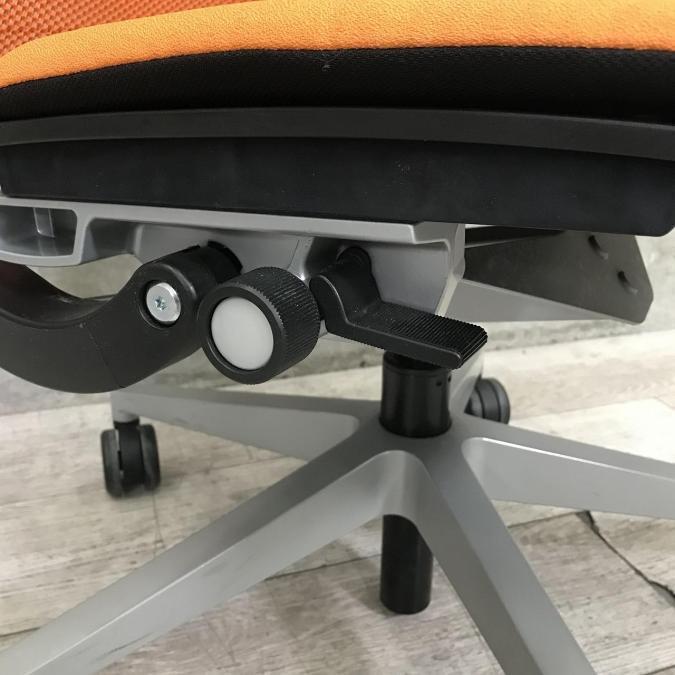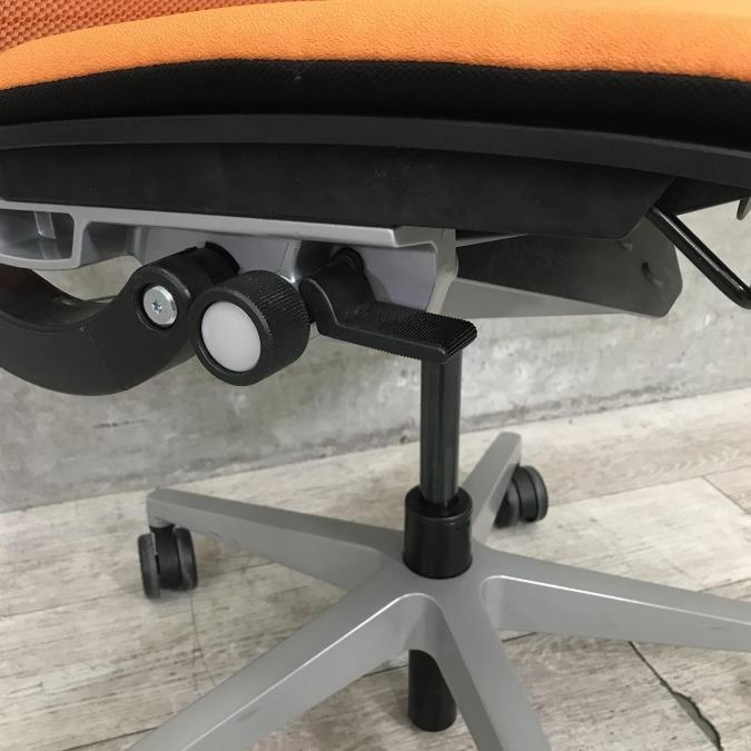 快適な座り心地に不可欠な調節機能である、上下昇降、座面の奥行き調整、リクライニングなどを備えており、操作もわかりやすく好評です。 特に、座面の奥行きは、座面下の左右に通った細いバーで調整でき、座ったままで軽やかに滑るように調整が可能です。 価格面では、新品では高めですが、中古は流通も多く、定価の3割前後の価格で高級チェアの座り心地を手に入れることができます!