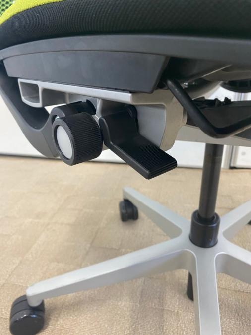- レバーを引き上げながら座面を前後にスライドさせ、レバーを放すとロックします。背もたれに身体をつけた状態で膝の裏側と座面のエッジの間に5-8センチほどの隙間ができるのが理想的です。