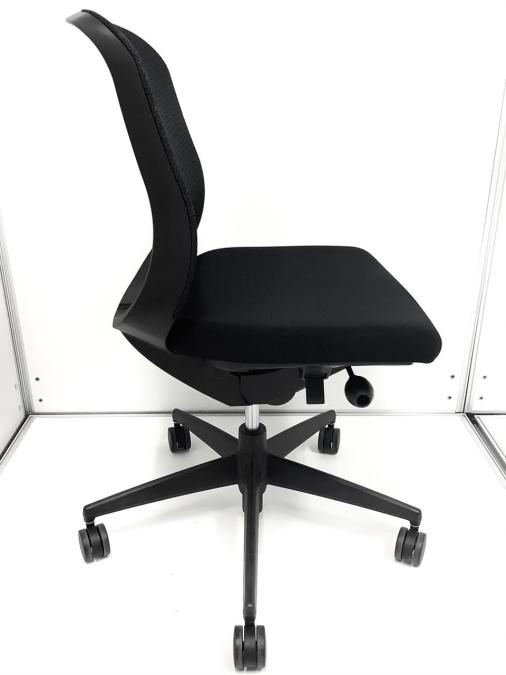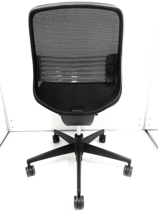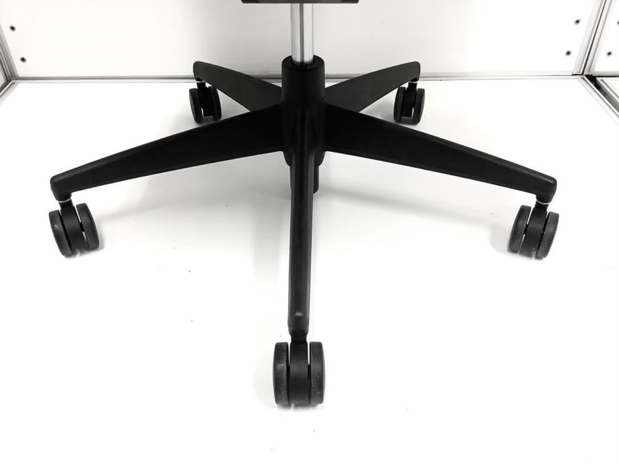 背もたれがメッシュのチェアは、構造上、外枠となるフレームが存在します。小さめのメッシュチェアは背中にフレームが当たったり、メッシュの弾性を十分に得ることができないので、一般にメッシュチェアは大型になりがちです。しかし、シロッコチェアは、フレームを横ではなく縦方向に厚くしたバーチカルフレームで強度を確保しており、 小さめのボディでありながらメッシュ面が広く作られています。