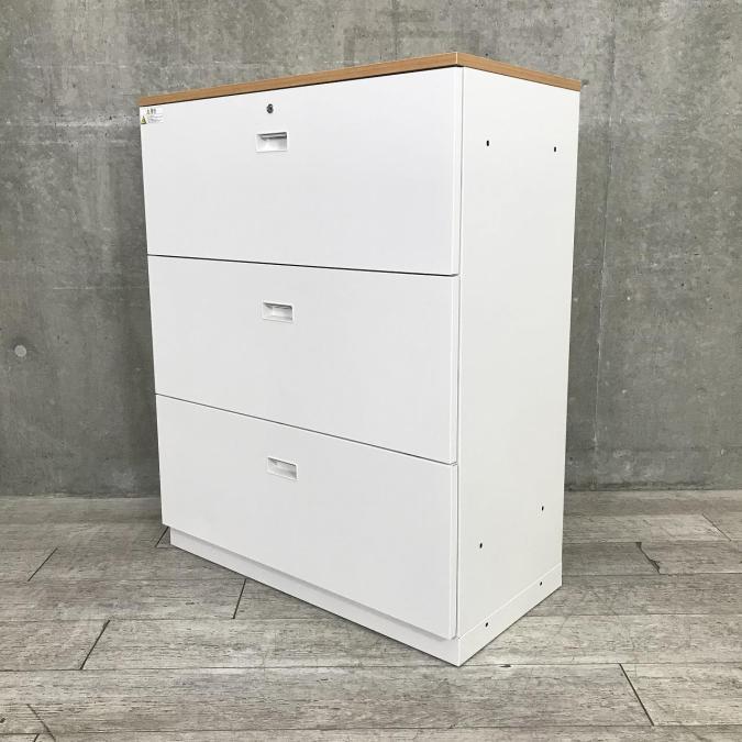 【人気3段ラテラルの小さめサイズ!天板付きのローキャビネット!】■イトーキ(ITOKI)製 シンライン(THIN LIN)シリーズ 3段ラテラル書庫 ローキャビネット ■天板付き ■ホワイト ■シリンダー錠 ※ラッチ日焼け有【AD】