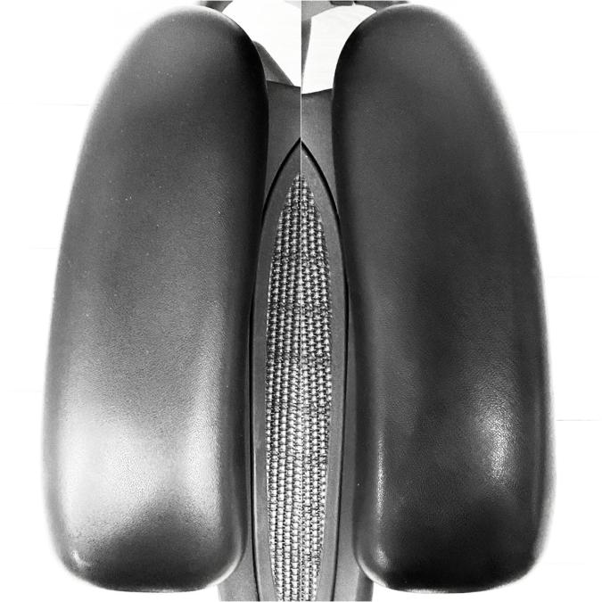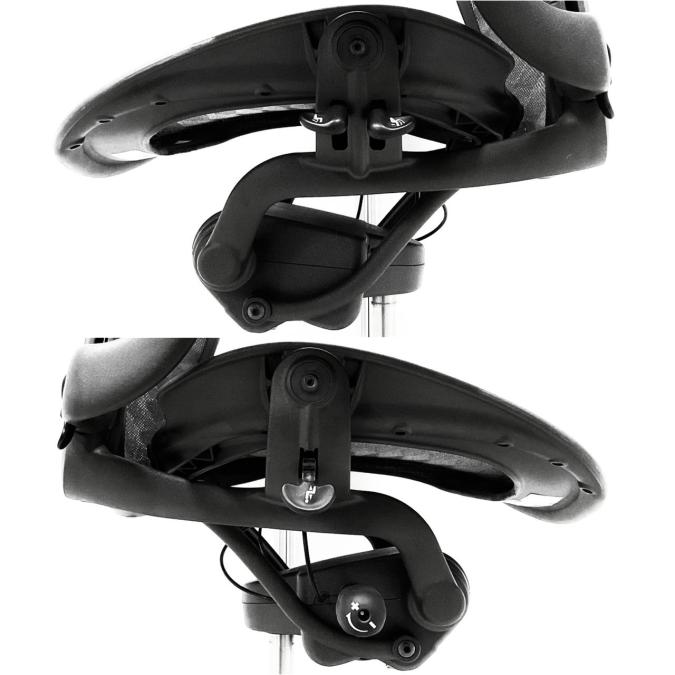 - 背もたれの裏にあるランバーサポート(パッド) の厚さは裏表で調節。上下の移動で、適切な高さ に調節できます。