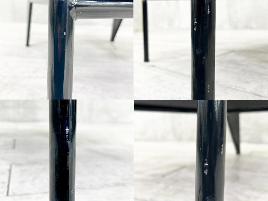 エンジニアでもあったプルーヴェは、椅子に座った時、後脚に最も負担がかかるという椅子の本質を見抜きデザインしました。かかる重さが比較的軽い前脚には細い鋼のチューブを使い、より大きな重さがかかる後脚には、太さをもたせた中空の鋼板を用いる事で椅子にかかる重さを床へ逃がせる構造になっています。