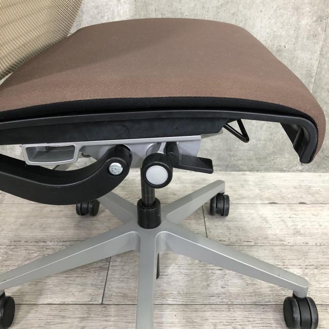 快適な座り心地に不可欠な調節機能である、上下昇降、座面の奥行き調整、リクライニングなどを備えており、操作もわかりやすく好評です。 特に、座面の奥行きは、座面下の左右に通った細いバーで調整でき、座ったままで軽やかに滑るように調整が可能です。 価格面では、新品では高めですが、中古は流通も多く、定価の3割前後の価格で高級チェアの座り心地を手に入れることができます!