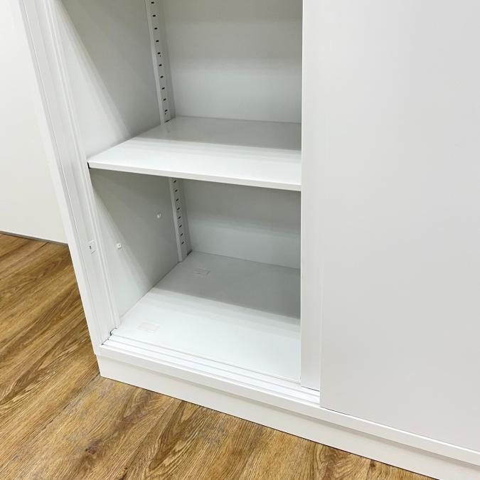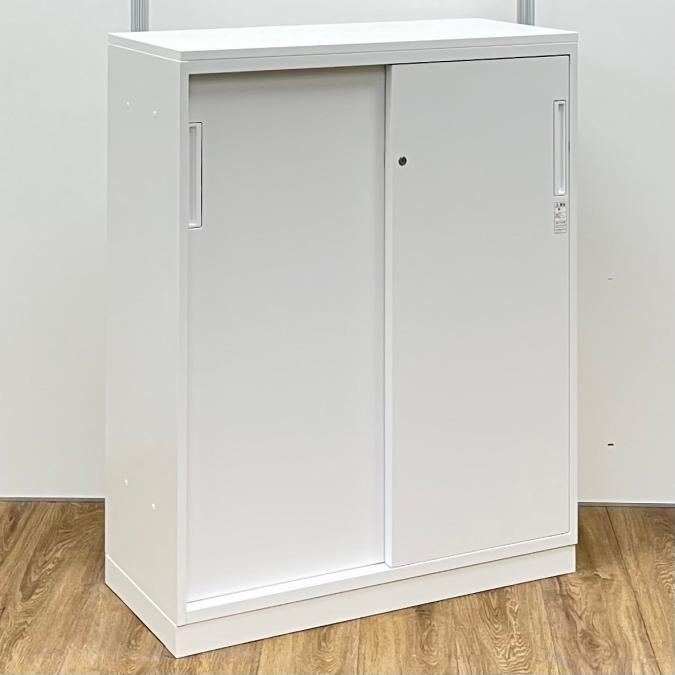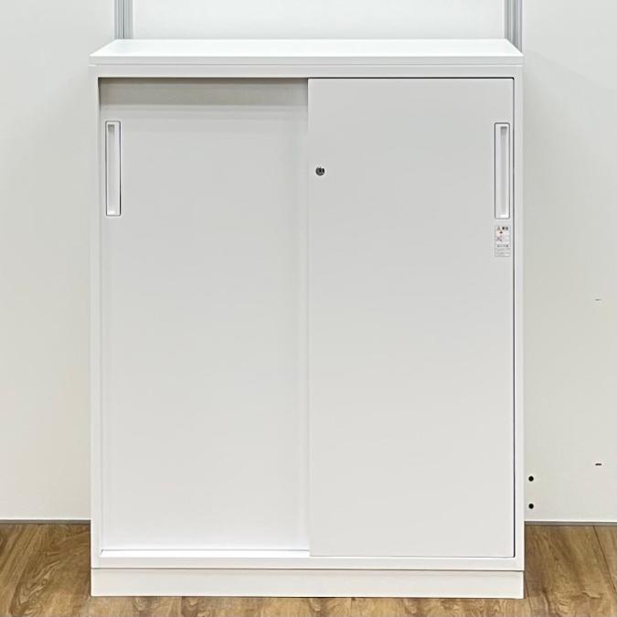 【スライド引き戸だから開閉スペースに困らない!】■コクヨ(KOKUYO)製 エディア(EDIA)シリーズ 2枚引き違い書庫 ローキャビネット シリンダー錠 天板付き ベース付き ホワイト シリンダー錠 収納 中古家具 格安 福岡 オフィス家具 九州最大級《オフィスバスターズ福岡博多店は、福岡を拠点として、日本全国へ中古オフィス用品・オフィス家具を提供しております》
