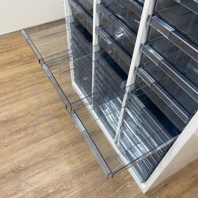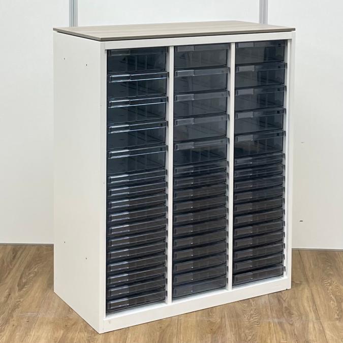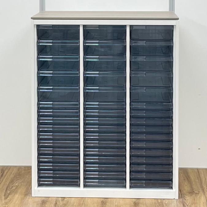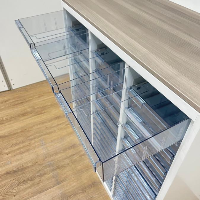【書類・備品整理の必需品!書類や備品のストックにピッタリ!※1段目のみ浅型仕様】オカムラ レクトライン クリスタルトレー 書類 引き出し 透明 ケース ローキャビネット 整理 中古家具 オフィス家具 福岡 九州最大級《オフィスバスターズ福岡博多店は、福岡を拠点として、日本全国へ中古オフィス用品・オフィス家具を提供しております》