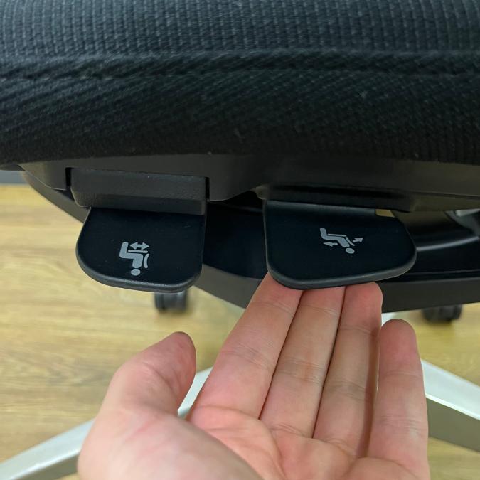 座面左下にあるレバーで、座面を前後(ストローク50㎜)にスライドできます。
