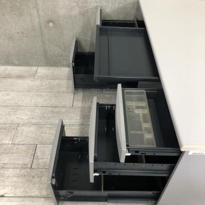正面から見て右側の引き出しは3段で、小物からA4サイズのファイルも収納可。