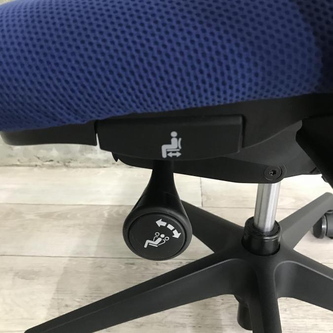- 座面の左にあるレバー操作により、座面の奥行き調整が可能です。(ストローク:50mm)