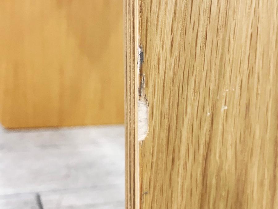 - 目立つ箇所複数あり深い傷・凹みが商品全体にある。(例、天板、幕板、棚板、サイド部分、脚部等にある。)