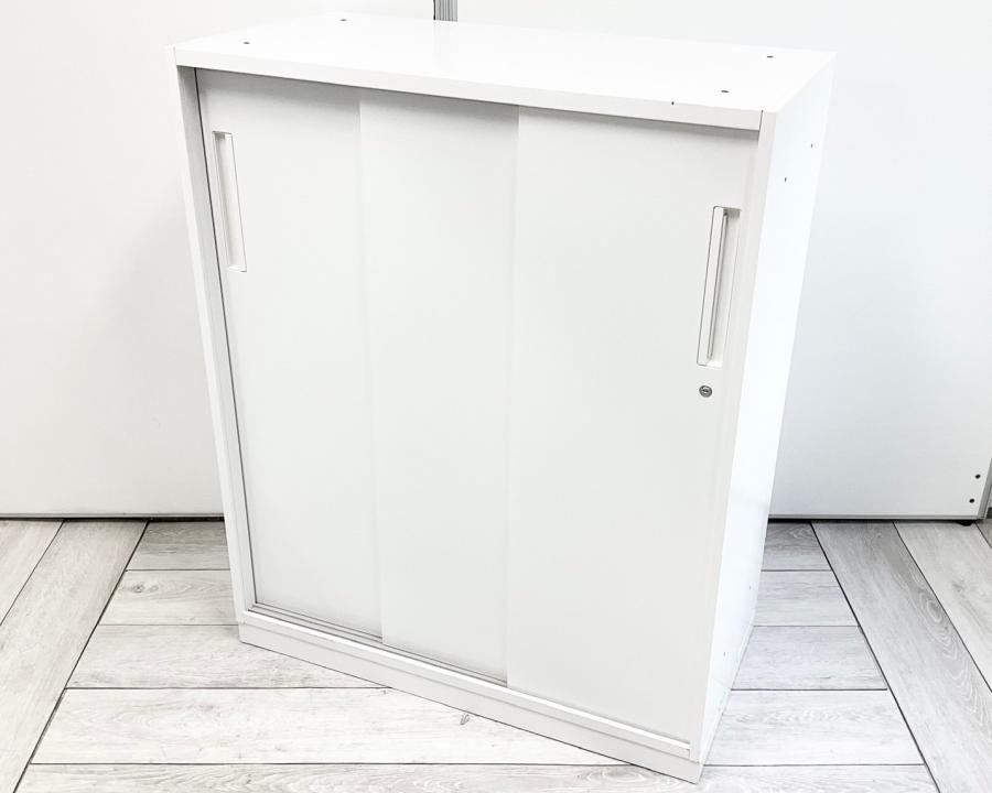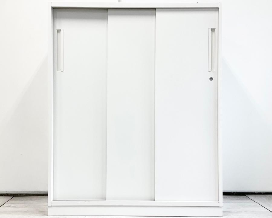 【6台入荷】【書類を一気に収納!スライド式扉は開閉スペースに困らない!】■ウチダ(UCHIDA)製 ハイパーストレージ(HS)シリーズ 引き違い書庫(2枚扉) ローキャビネット ■ホワイト ■シリンダー錠 ■ベース付き