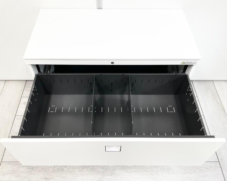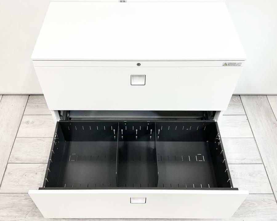 【使いやすさで選ぶならコレ!大容量の三段キャビネット】■オカムラ(Okamura)製 レクトラインシリーズ(Rectline) 3段ラテラル書庫 ローキャビネット ■天板付き ■シリンダー錠 ■ホワイト