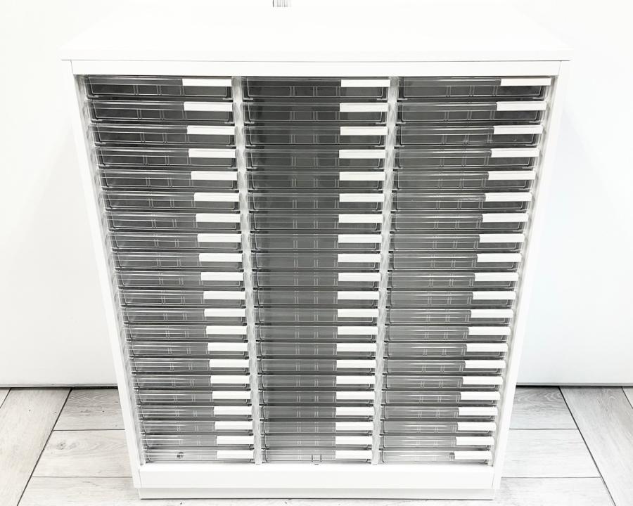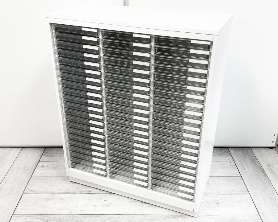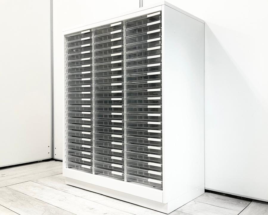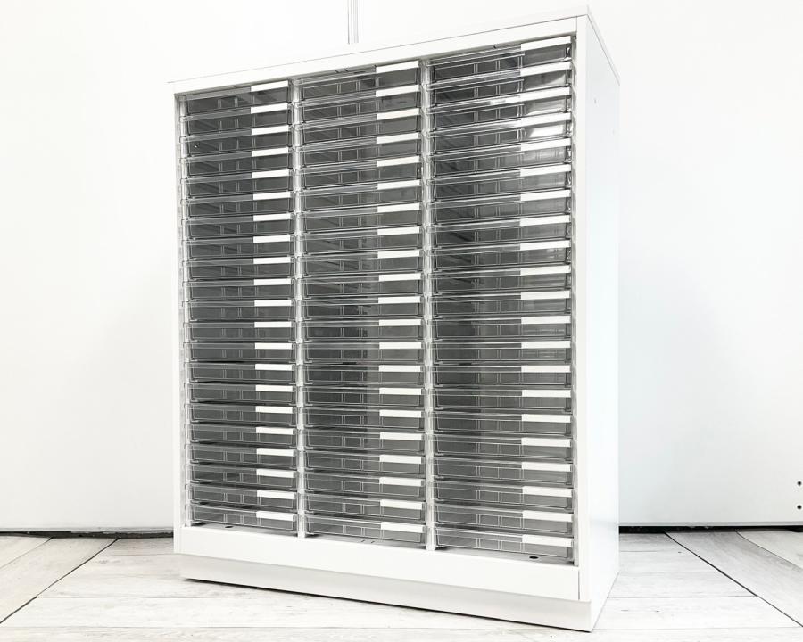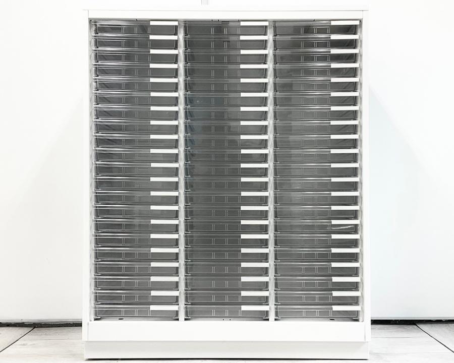 【書類・備品整理の必需品!】【珍しいクリトレが入荷!3列×浅型11段+深型5段】■イトーキ(ITOKI)製 シンラインシリーズ クリスタルトレー ローキャビネット ■3列×浅型11段+深型5段 ■天板・ベース付 ■色:ホワイト