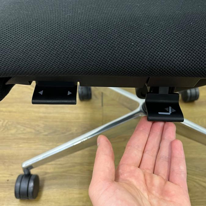 また、個人的にオススメなのは『フルアジャスタブル肘』というアーム部分が斜め前に伸びていくタイプの肘置きを搭載したモデルです。高さを上げれば上げるほどパッドが前方に迫り出していくので、デスクワークの際にちょうど肘を置きたい場所に肘置きがきます。これがとても快適なので、ぜひ一度お試しいただきたいです!*エルフィチェアの肘パーツはフルアジャスタブル肘の他に、固定肘、アジャスタブル肘などがあります。