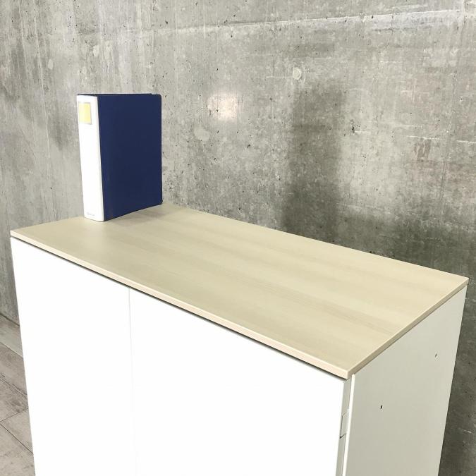 【オフィスの書類をスッキリ整理!取っ手がどの方向からでも開くマルチハンドル!】■オカムラ(okamura)製 レクトラインシリーズ 両開き書庫 ローキャビネット ■本体色:ホワイト ■シリンダー錠 ■ナチュラル天板付き