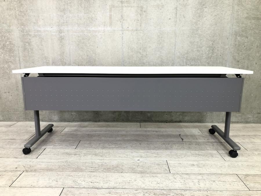 【2~3名様で使えるスタックテーブル入荷!キャスター付きで移動も楽々!】■UCHIDA(内田洋行)製 A-stack サイドスタックテーブル ■幅1800×奥行600 ■幕板付き ■ホワイト×グレー【天板跳ね上げ式でコンパクトに収納】- 岐阜店
