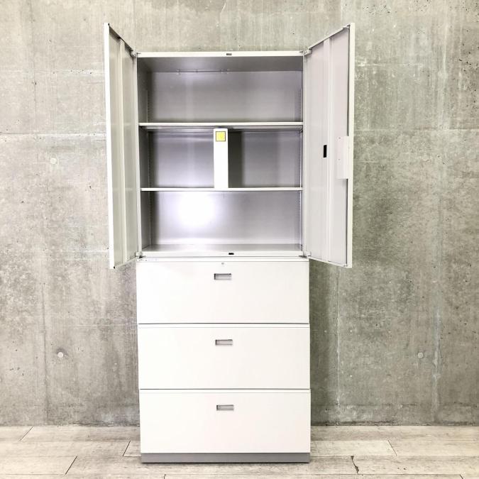 【倉庫在庫品】【これ1台で書類整理の問題が解決!上下で6段分の大容量収納!】■イトーキ (ITOKI)製 シンライン ハイキャビネット 両開き+3段ラテラル 書庫セット ■グレー ■シリンダー錠