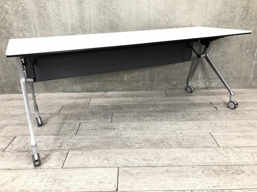 【幕板付き】2~3名様で使えるスタックテーブル ■オカムラ(okamura)製 インターアクトNT サイドスタックテーブル ■ホワイト 幕板付き ■幅1800×奥行600【天板跳ね上げ式でコンパクトに収納】【キャスター付きで移動も楽々!】- 岐阜店
