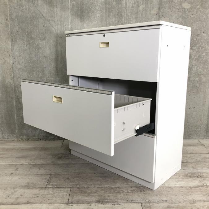 【A4ファイルも沢山収納可能!ホワイトカラーの人気シリーズ3段ラテラル書庫!】■イトーキ(ITOKI)製 シンラインシリーズ (THIN LINE) 3段ラテラル書庫 ローキャビネット ■シリンダー錠 ■ホワイト