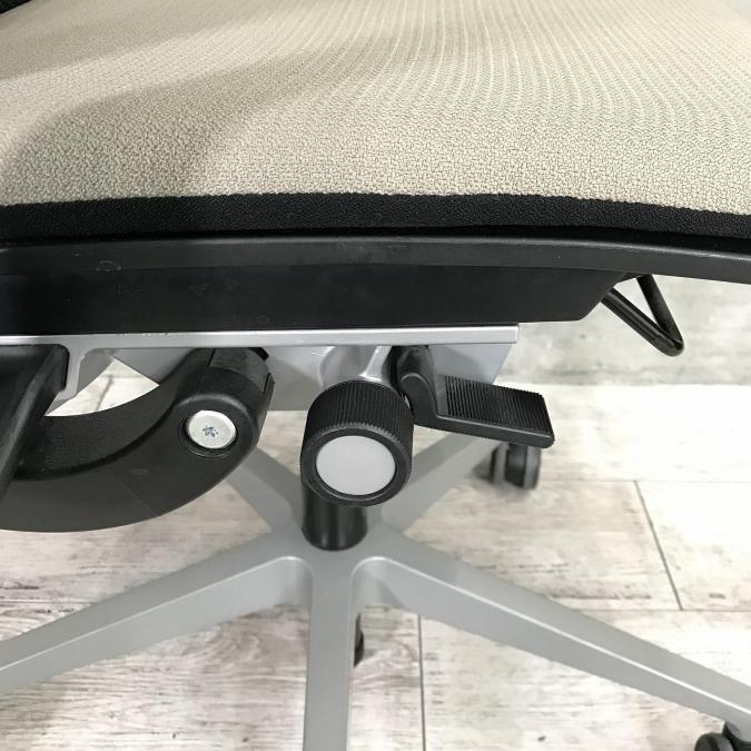 快適な座り心地に不可欠な調節機能である、上下昇降、座面の奥行き調整、リクライニングなどを備えており、操作もわかりやすく好評です。 特に、座面の奥行きは、座面下の左右に通った細いバーで調整でき、座ったままで軽やかに滑るように調整が可能です。 価格面では、新品では高めですが、中古は流通も多く、定価の3割前後の価格で高級チェアの座り心地を手に入れることができます!