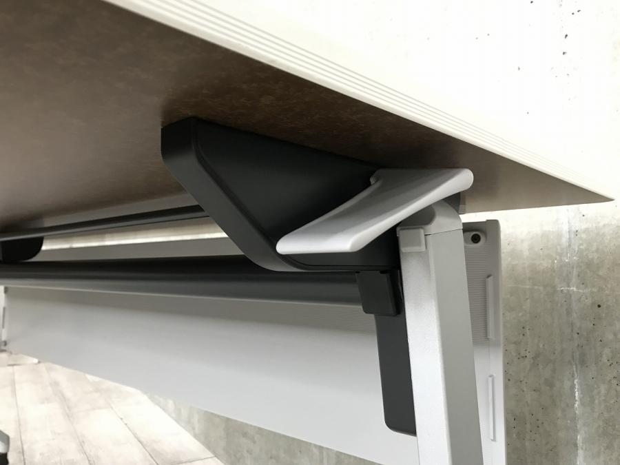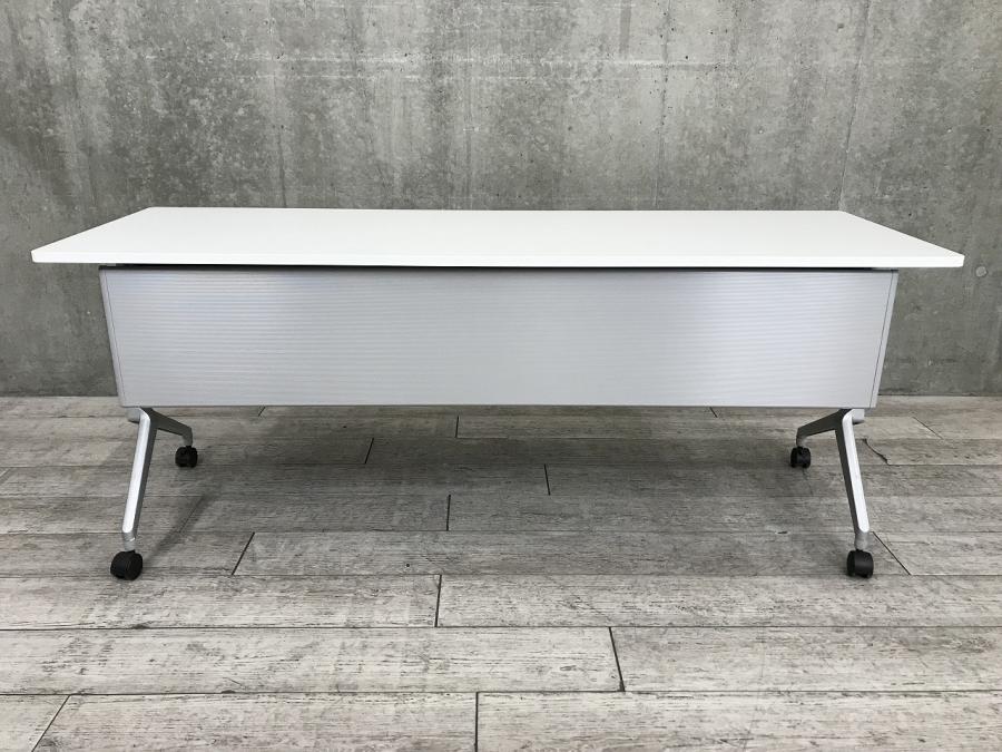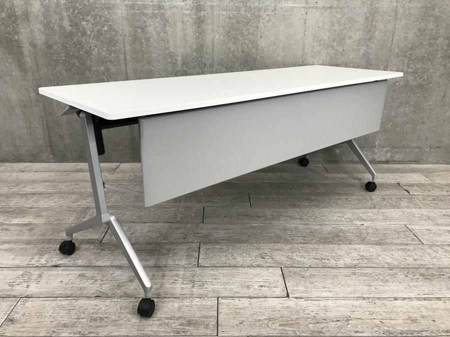 【2~3名様で使えるスタックテーブル】■KOKUYO(コクヨ)製 リーフライン サイドスタックテーブル ■幅1800×奥行600 ■幕板付き ■ホワイト×グレー【天板跳ね上げ式でコンパクトに収納】- つくば店