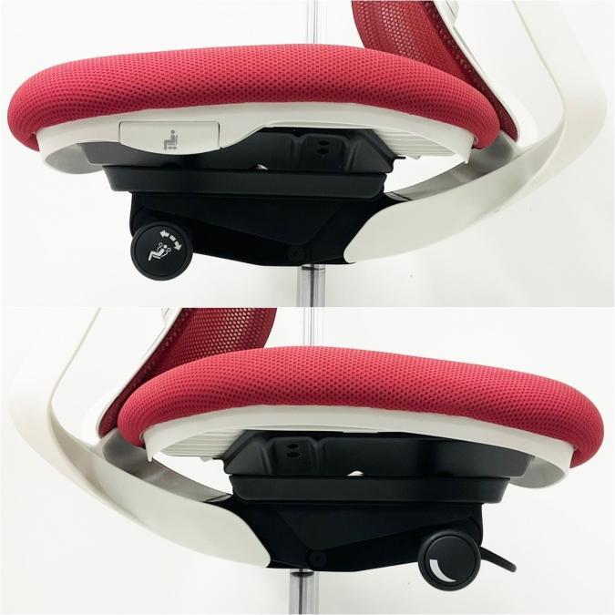 - 座面右下のダイヤル操作で、リクライニングの強弱調整が行えます。これまでのダイヤル式よりも、少ない回転数で、最弱?最強の調整が可能です。