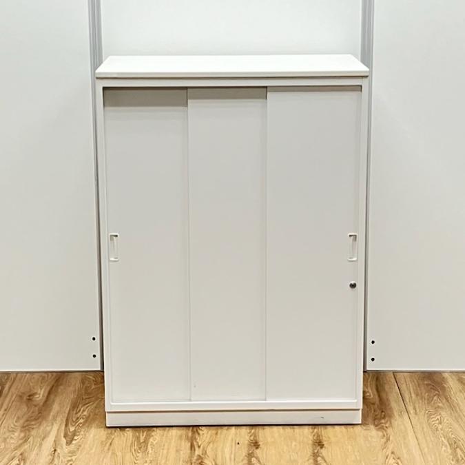 【スライド式なので開閉スペースに困りません!人気の3枚引き戸書庫!】■イトーキ (ITOKI)製 シンラインシリーズ 引き違い書庫 ローキャビネット 3枚引き戸 H1120㎜ ■天板付 ■ホワイト ■シリンダー錠