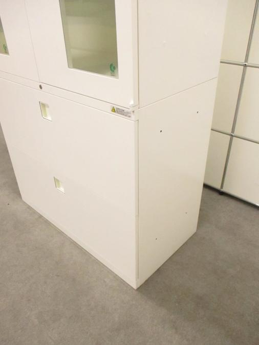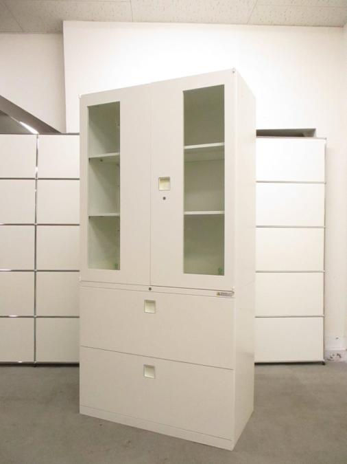 スライド式の扉+引き出しタイプの便利な書庫セットが入荷!使い勝手抜群のハイキャビネットが入荷! ■オカムラ/レクトライン/ホワイト 2枚引き戸+3段ラテラルキャビネット