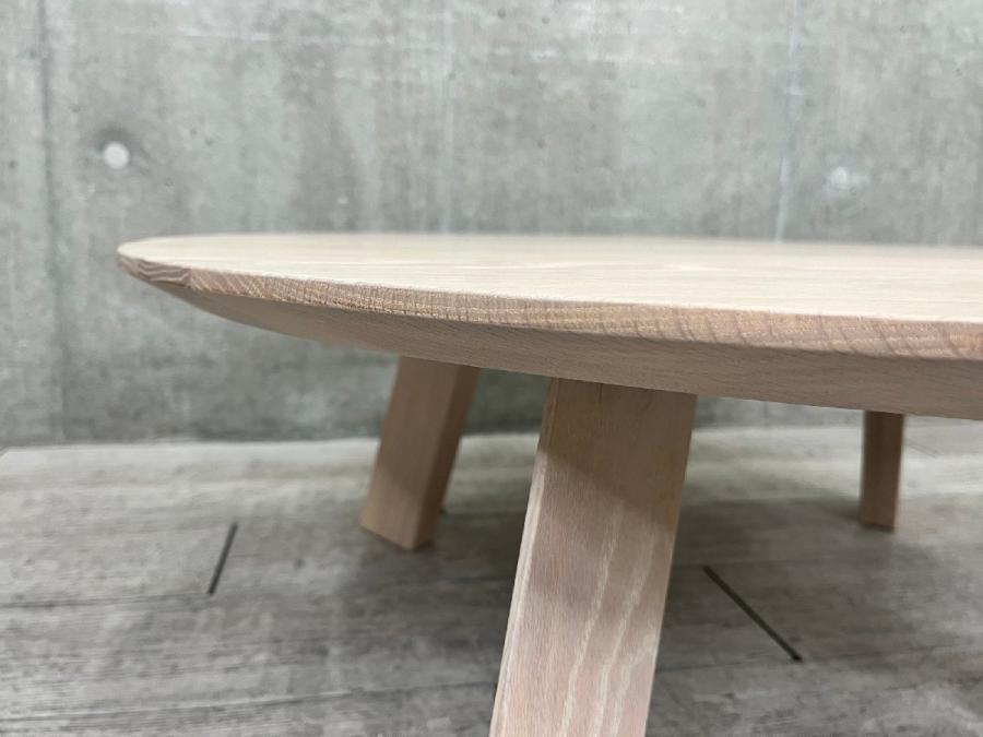 鋭角な三角形の断面の脚に視線が留まる円形ローテーブル。角度をつけて天板とジョイントすることで、見る角度によって多彩な表情が生まれます。できるだけ削がれた天板の面形状がシャープな印象をより高めています。