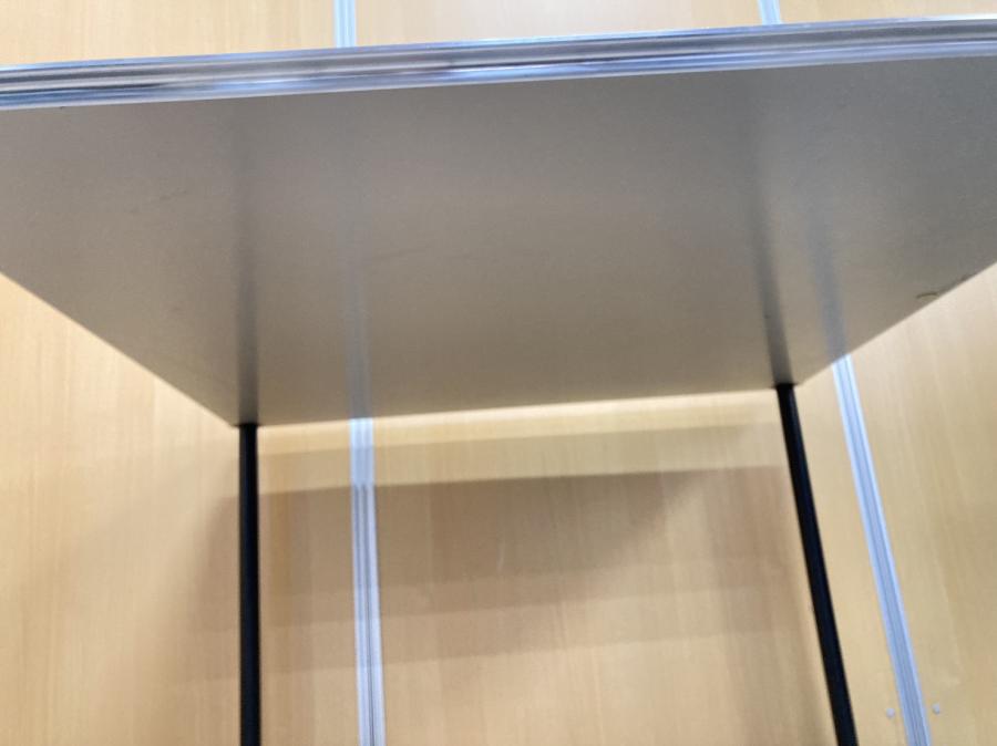 - 一部不具合あり天板歪み、アジャスター無し、キャスター使用不可ようなそのテーブルの本来の効用を果たすための機能以外の一部が使用不可な状態。(例、キャスターロッ ク機能使用不可、棚板無し等がある。)