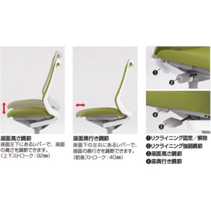 - 基本的な、高さ調節、リクライニング機能に加え、肘掛の高さ、肘あての前後・角度調節、座面奥行き調節など充実の機能を搭載。