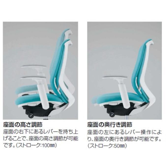 - 座面の左にあるレバー操作により、座面の奥行き調整が可能です。(ストローク:50mm)
