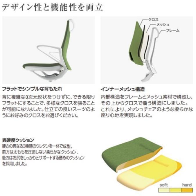 - 背もたれ内部はフレームとメッシュで構成され、その上をクロスで覆うインナーメッシュ構造。柔らかく通気性の良い座り心地です。