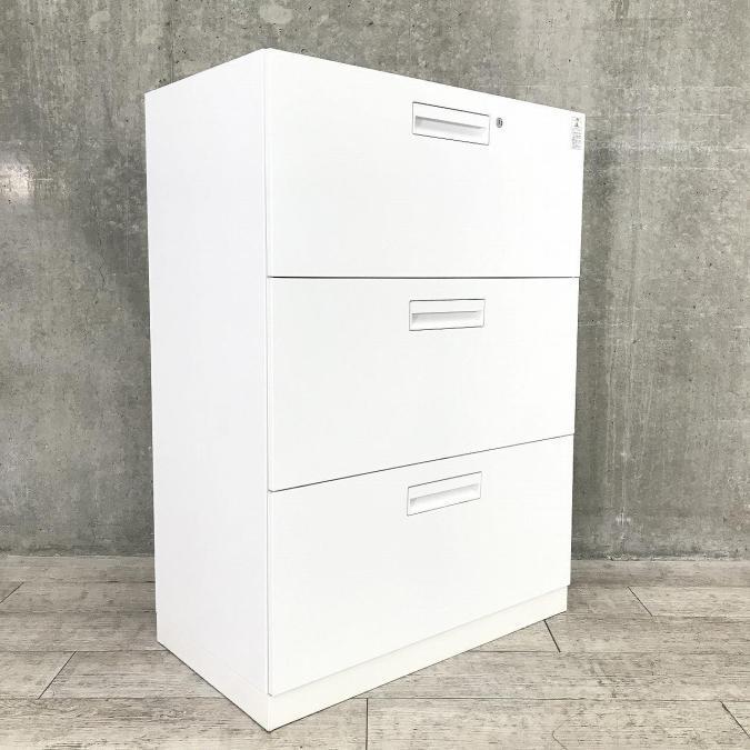 【4台入荷】【収納力抜群の3段ラテラル書庫!A4書類が大量に収納可能!】■コクヨ(KOKUYO)製 エディア(EDIA)シリーズ 3段ラテラル ローキャビネット ■天板/ベース付き ■ホワイト ■シリンダー錠