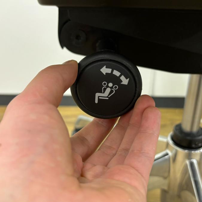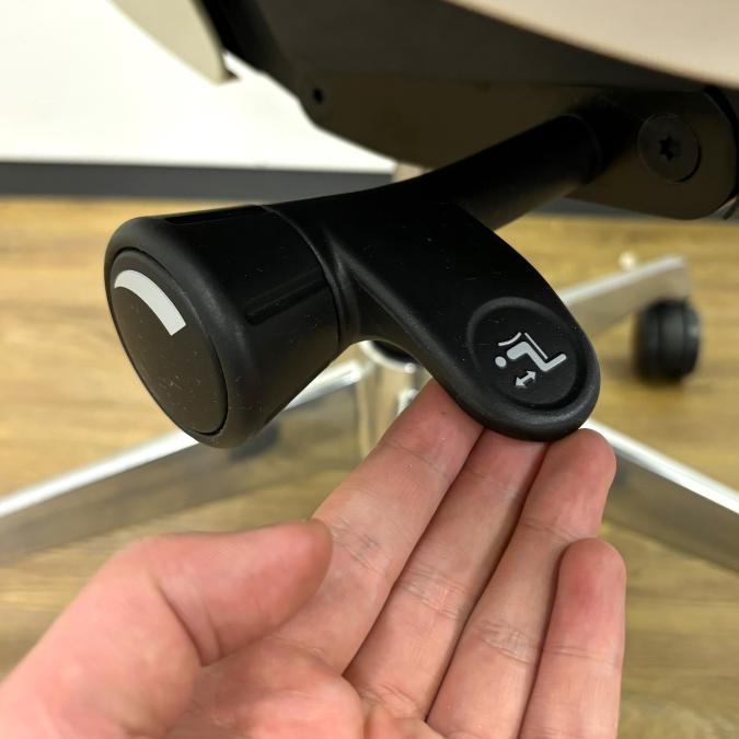 - 座面右下のダイヤル操作で、リクライニングの強弱調整が行えます。これまでのダイヤル式よりも、少ない回転数で、最弱?最強の調整が可能です。