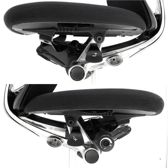両手えお自然に下した位置にあるレバーで、座面の奥行きを前後に50mm調節出来ます。