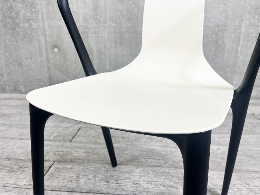 この椅子の最大の特徴はシートシェルです。シートシェルは、ベルヴィルチェアのアイデンティティとなる部分であり、素材や色に応じてイメージが変化します。スレンダーな黒のフレームは、脚や背面に向かって書道の線を思わせるようなラインを描いています。一方シートシェルは、広めの座面が背もたれにかけて細くなっていき、非常に薄いシェルを支えています。