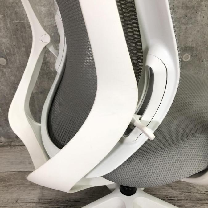 【1脚限定の為、クレジット決済優先!】オカムラ製 シルフィーシリーズ ライトグレー ホワイトフレーム デザインアーム※固定肘 コートハンガー 樹脂脚 メッシュ仕様 大人気前傾チェア 背のカーブを変えられる新感覚のオフィスシーティング 肘付きローバックチェア!!