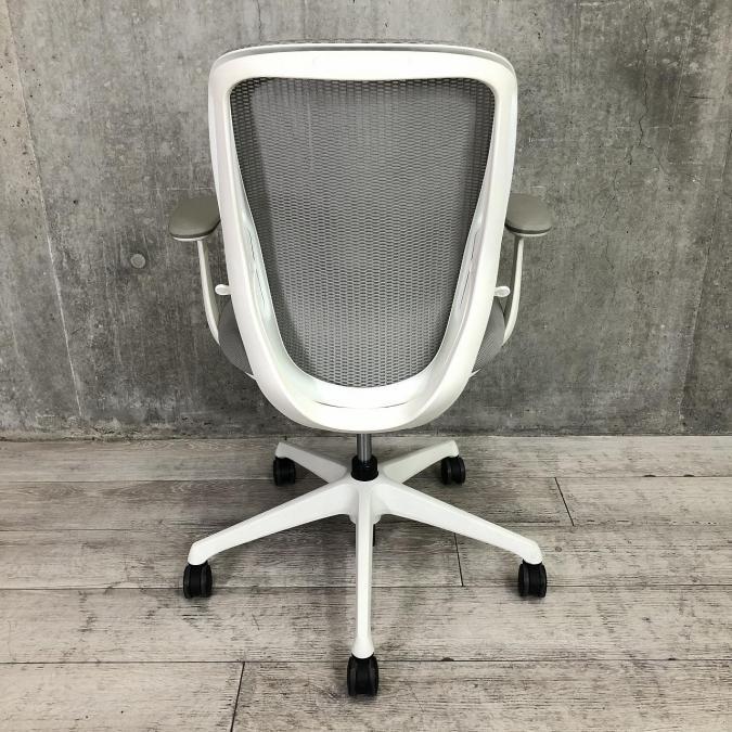 【1脚限定の為、クレジット決済優先!】オカムラ製 シルフィーシリーズ ライトグレー ホワイトフレーム デザインアーム※固定肘 コートハンガー 樹脂脚 メッシュ仕様 大人気前傾チェア 背のカーブを変えられる新感覚のオフィスシーティング 肘付きローバックチェア!!