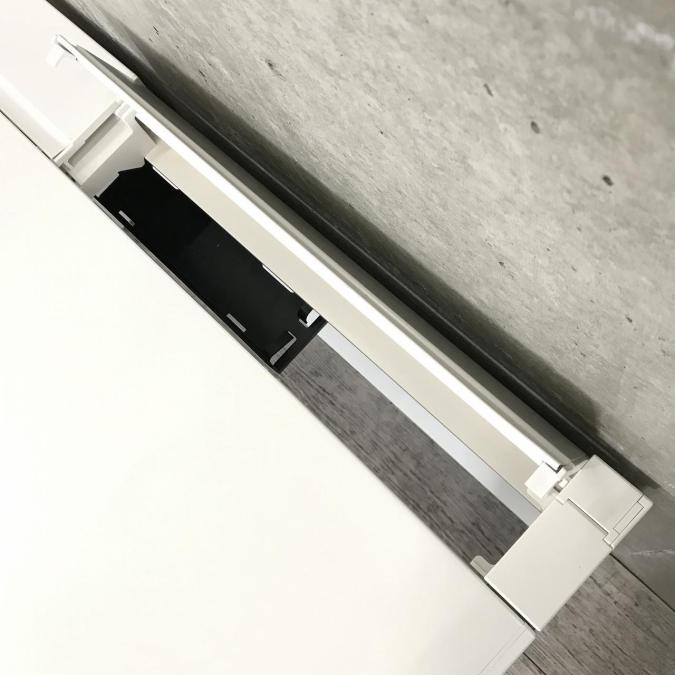 天板奥に一直線に通った大きな配線機能は、開閉カバーが2分割されており、