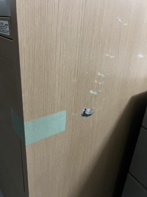 - 目立つ箇所複数あり深い傷・凹みが商品全体にある。(例、天板、正面、背部、サイド部分にある。)