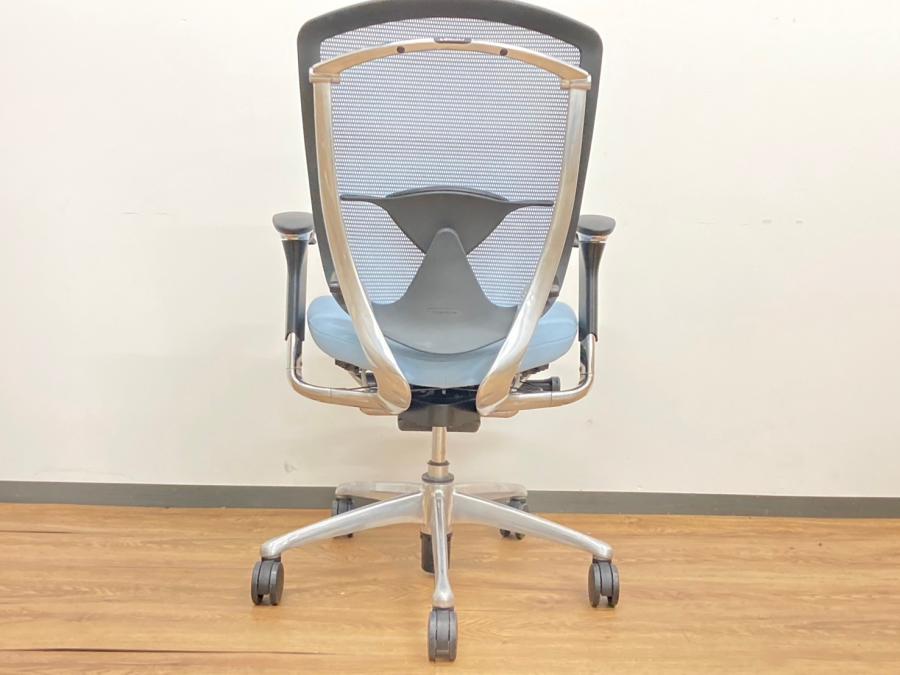 【K9】【商品入替のため、残り7脚限り】【座面に使用感の汚れあり】オカムラ製 コンテッサシリーズ ライトブルー 背面メッシュ ランバーサポート付 可動肘 世界で認められた革新的タスクチェア! 人間工学に基づいた快適な座り心地を実現! 肘付きハイバックチェア!!