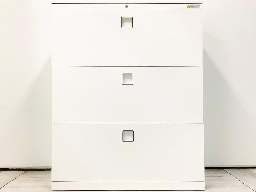 【ファイル収納にオススメ!高品質で使いやすい人気シリーズの3段ラテラル書庫!】■オカムラ(okamura)製 レクトラインシリーズ 3段ラテラル書庫 ローキャビネット H1100㎜ ■ホワイト ■シリンダー鍵 ■天板付き(天板:ホワイト) ※日焼け有