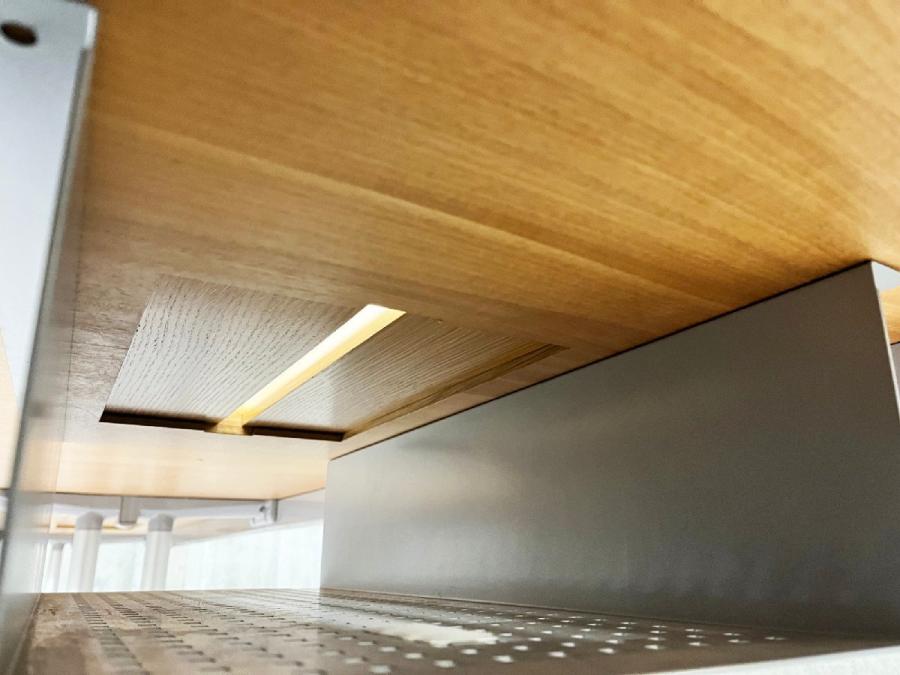 テーブルトップには、弾力性のあるポリプロピレン材を挟み込んだブナエッジがついています。